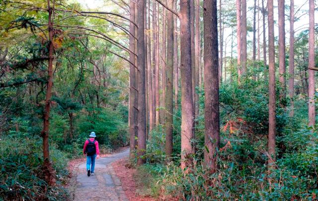 穿行在山间,空气清新宜人,秋日林间光影交错。沿途可以遇到奇石怪洞,远处还能看到云海彩霞,一路欣赏风景走到天童寺,边游览边感受古寺的禅意。