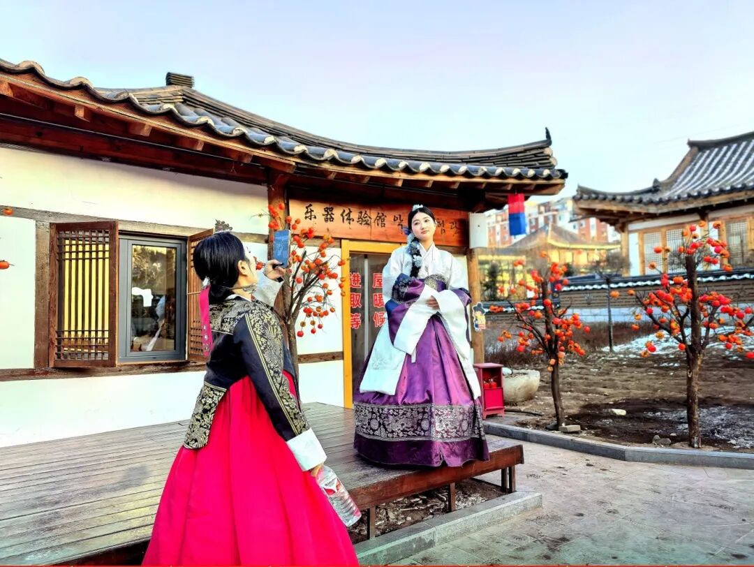 在在中国朝鲜族民俗园、春兴古村落,穿上朝鲜族服饰漫步于青瓦白墙间,仿佛瞬间穿越。