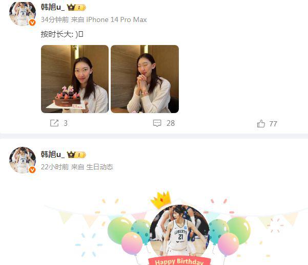 中国女篮内线核心韩旭更新社交媒体,晒出自己手捧蛋糕的照片,为自己26岁生日庆祝,还配文“按时长大”。