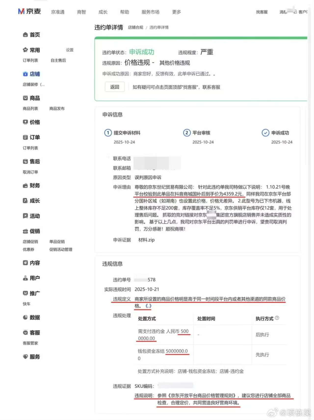 具体是10月21日,京东发现美的某产品在抖音商城国补后到手价4359.2元,认为比该产品在京东价格低,要求美的支付500万违约金。但美的觉得冤枉,这是清仓下市机器,在京东仅预备12套,且实际价格差别不大,10月24日申诉成功。