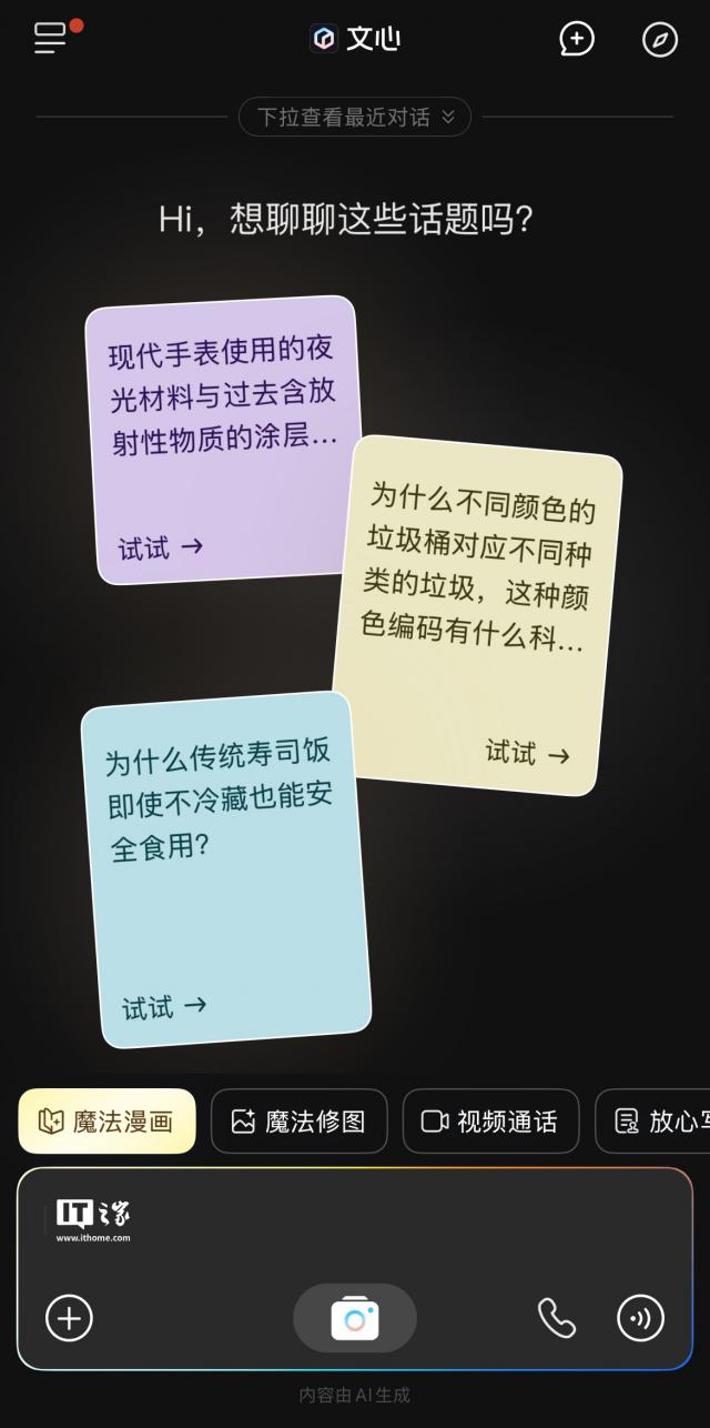 全方面覆盖搜索:可搜地图导航、医疗健康、专业百科、影视小说、表格导图;支持多种提问形式,语音问、视频问、图片问、文档问均可。魔法漫画功能:只需一张照片和一句话,就能开启漫画世界,一键生成多页漫画。还具备续写改写功能,超多玩法和可能性可自定义。更有创意修图玩法:甚至无需输入文字,点击即可获取神奇的风格照片,还能定制创意,体验创造性修图的乐趣。更放心的文本创作:“放心写”功能助力专业文本写作,无论是汇报材料、讲话发言、工作总结,还是教案、小说;丰富了更多改写、润色、撰写的不同场景,深入查证校对资料与事实,让你放心创作,不再担心引用错误。视频通话:可随时发问、随时打断,支持多种外语及方言,涵盖数个定制化场景,无论是旅行导游、口语助手,还是生活百科、娱乐休闲,打开通话,一键满足需求。视频生成:单图可动起来,多图能串联生成,还可首位帧定格视频。多样玩法全部支持,更有超多创意特效模板等你来一键做同款。AI PPT:支持上传参考文档,支持上传心仪模板,定制化承接你的ppt制作需求,更便捷、更省心,大纲和页面均可修改,导出格式多样化。