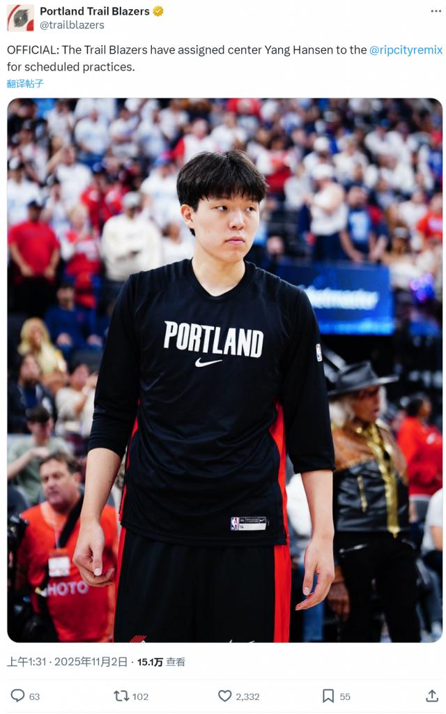 北京时间11月2日,波特兰开拓者官方宣布,将杨瀚森下放至发展联盟的撕裂之城混音队进行训练。杨瀚森会在11月4日对阵湖人的比赛时,重新回归开拓者。也就是说,杨瀚森暂时不用在发展联盟打比赛,只是被下放训练。