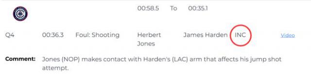 第一次是漏判,发生在距离比赛结束还有36.3秒时。当时哈登在琼斯的防守下出手三分,结果投了个“三不沾”,哈登当即向裁判抱怨自己被犯规了,但裁判并未理会。裁判报告指出,琼斯在防守时与哈登的手臂发生了接触,这一接触影响了哈登的跳投动作,属于三分投篮的犯规漏判,哈登本应获得三次罚球机会。这次漏判让快船吃亏,鹈鹕获利。