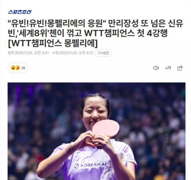 值得一提的是,本次蒙彼利埃冠军赛四强选手中有两位来自韩国乒坛(朱芊曦、申裕斌),这再次创造了韩国乒坛的历史,韩国乒乓球队首次在WTT1000+赛事中有两位选手同时进入半决赛。