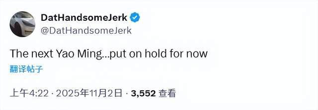 球迷DatHandsomeJerk称:“下一个姚明 …… 目前只能暂时搁置。”