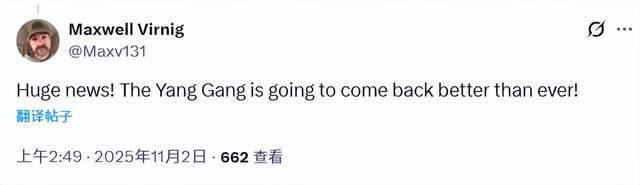 球迷Maxwell Virnig乐观地感慨:“天大的好消息!‘杨之队’一定会强势回归,变得比以往更棒!”