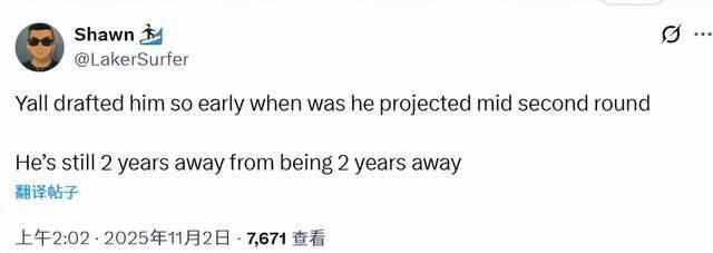 球迷Shawn批评道:“你们当初选他选得太早了——之前预测他第二轮中段才能被选中。以他现在的水平,就算再等两年,距离真正打出来也还得再等两年。”