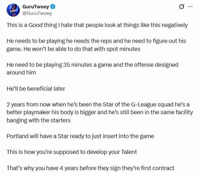 球迷GuruTwoey认为:“这绝对是件好事,真不希望大家把这件事往负面想。他当下就应该多打球,需要足够的出场时间,还得找到适合自己的比赛节奏。零散的出场时间根本无法满足这些需求。他应该每场打35分钟,球队还需围绕他设计进攻战术。他日后肯定能发挥巨大作用。两年后,等他成为发展联盟球队的核心,传球能力会更强,身体也会更壮实,而且在此期间他还能一直在开拓者的训练馆里,和主力球员一起训练提升。到那时,开拓者就能直接拥有一位随时能上场的球星了。这才是培养新秀应有的方式。不然新秀合同为何会有4年的成长期呢?”