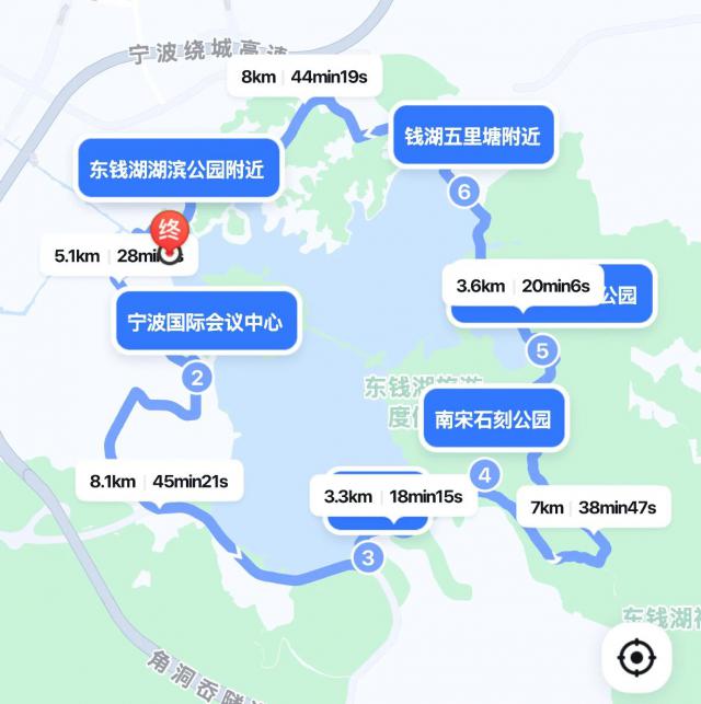 总长约35公里,从东钱湖湖滨公园出发,途经宁波国际会议中心、韩岭老街、南宋石刻公园、东钱湖下水湿地公园、钱湖五里塘,最后回到湖滨公园,环湖一圈。