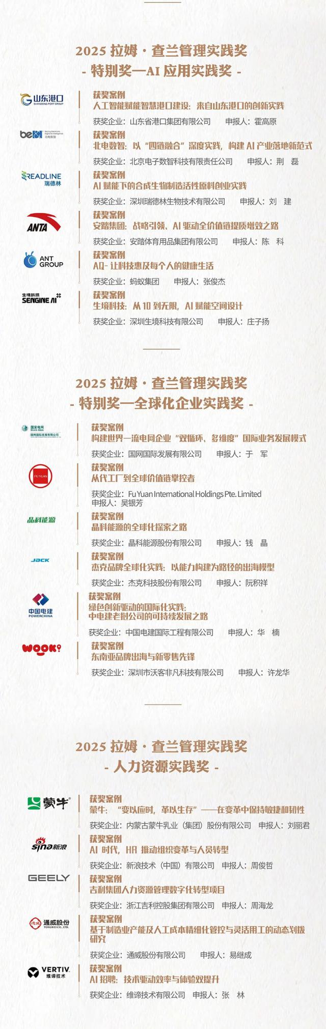 在全球科技竞争加剧、人工智能浪潮深度赋能各行业的背景下,2025年拉姆·查兰管理实践奖特别关注“人工智能 + ”与传统产业的深度融合,旨在发掘通过AI技术推动产业向高端化、绿色化、智能化升级,显著提升生产效率与经济效益的优秀管理实践。