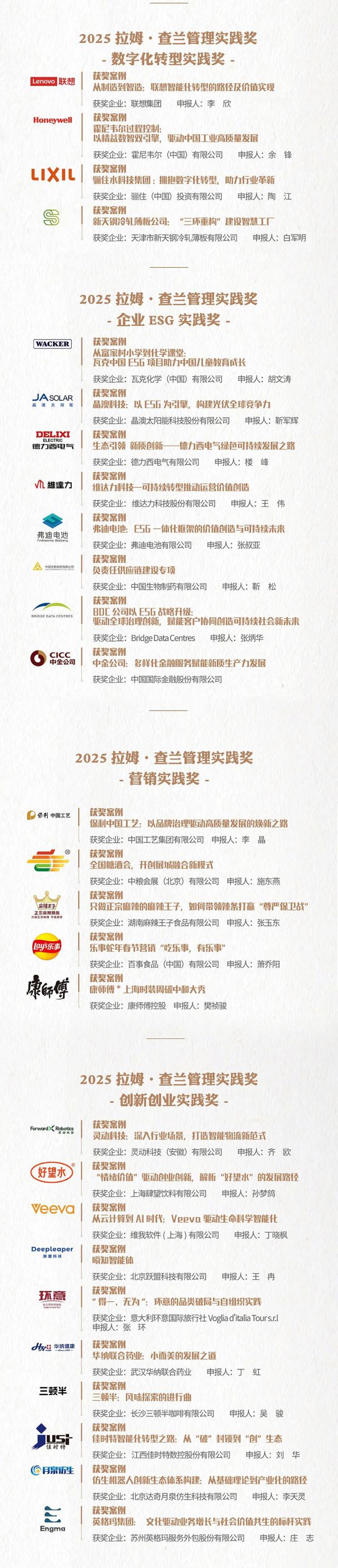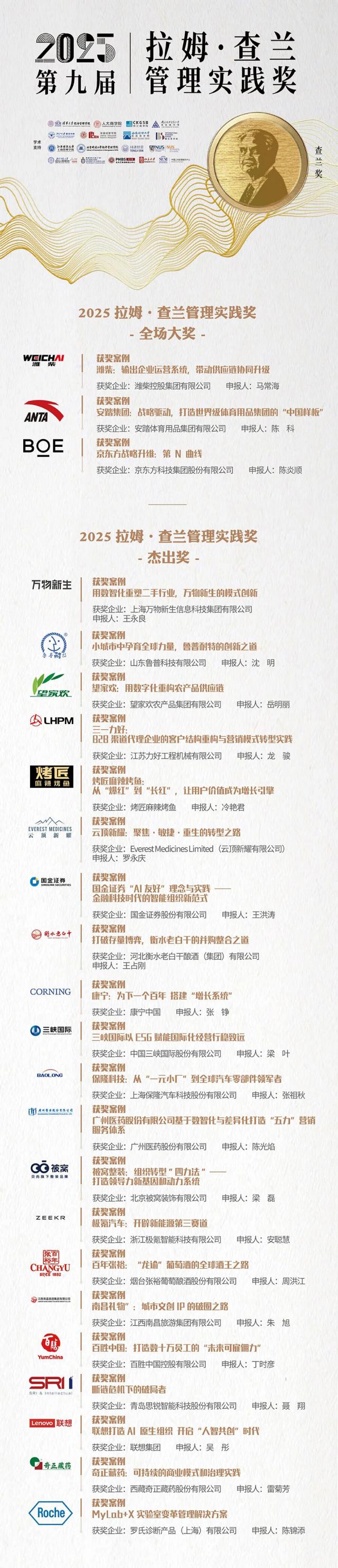 不断寻找企业管理中具有前瞻性和创新性,能创造经济效益和社会价值的精英人物,为中国本土企业提供学习和借鉴的经验,是拉姆·查兰管理实践奖多年不变的使命和初衷。祝贺以下获奖案例,让我们看到在人工智能时代,优秀管理实践的勃勃生机与无限可能。