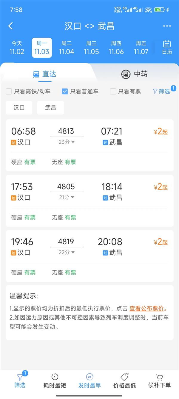 汉口站到武昌站共有三趟车次,分别是4813次、4805次、4819次,时段涵盖早高峰、晚高峰等,用时在21分钟至23分钟之间。而乘坐地铁走同样线路,需要42分钟,票价为5元。