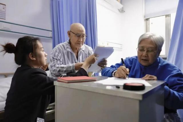 婚姻登记服务中心与养老服务体系紧密融合,在日常探访中收集老人婚姻登记需求,提前介入、主动对接,让便民服务更有前瞻性和针对性。活动现场没有繁琐流程,只有贴心陪伴与浪漫仪式感。工作人员半蹲在轮椅旁,教老人握笔在补领表格上签名;对视力不好的老人,亲切地在耳边逐字解读信息,反复确认出生日期等内容,确保不出差错。