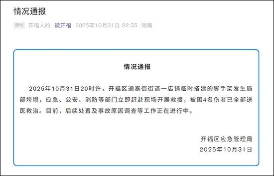 10月31日晚,湖南省长沙市开福区应急管理局通过微信公众号“微开福”发布情况通报,2025年10月31日20时许,开福区通泰街街道一店铺临时搭建的脚手架发生局部垮塌,应急、公安、消防等部门迅速赶赴现场展开救援,被困的4名伤者已全部送往医院救治。目前,后续处置及事故原因调查等工作正在有序进行。