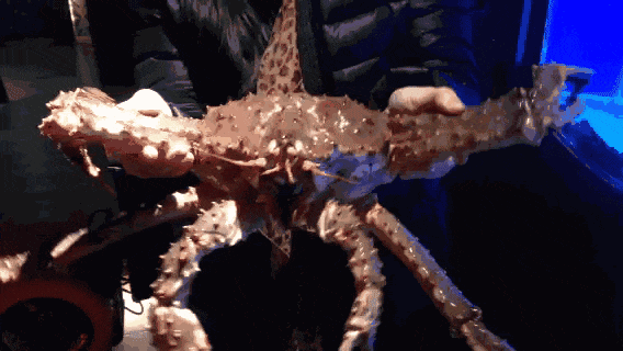 吉林市游客王欢欢举着手机拍摄帝王蟹,笑着对记者说:“早就听说珲春的帝王蟹新鲜又实惠,这次专门带着家人来尝鲜!”