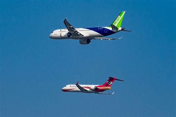 其中,ARJ21先行着陆,C919继续进行低空通场、大俯仰角爬升等单机飞行表演。