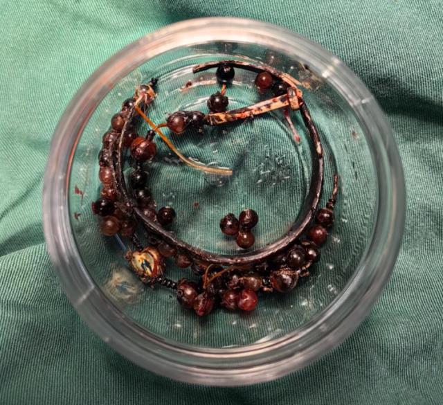 直到最近,她的手腕疼痛加剧,不仅红肿明显,还伴有脓液渗出,这才惊恐地发现手镯和串珠已经部分“长”进了肉里,根本无法自己取下来。最后,医生经过一个多小时的精细手术,才把手镯和串珠从龚女士的手腕中取出来,并且进行了清创引流来控制感染,这才让患者转危为安。