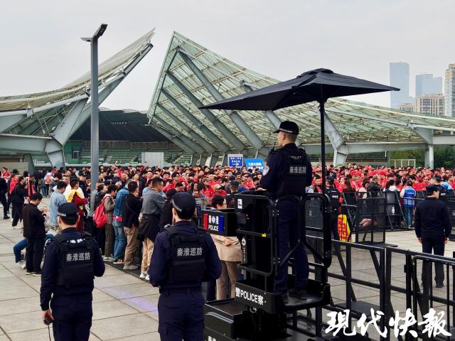 “高台见警”,能让观众切实感受到安全。秦淮分局执勤民警表示,站在高台上,视野高度达5米多,相当于二层楼的高度,区域内的人流、车流、风险点都能尽收眼底;同时高台集成的大功率扩音系统,能让民警的声音覆盖整个区域,无论是赛前安检、散场疏导还是寻人喊话,都能高效实现“看得见、喊得应、指得准”。