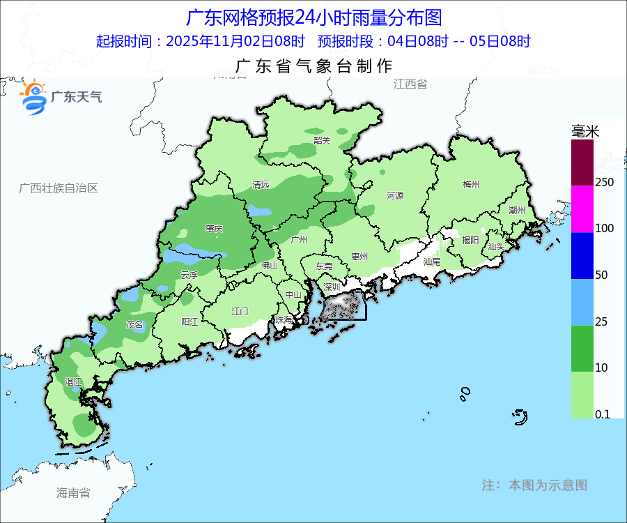 11月4日,韶关、清远、河源北部、梅州北部、珠三角西部和粤西市县阴天有中到大雨,其余市县多云转阴天有小雨。最低气温:南部沿海市县19 - 21℃,粤北偏北市县13 - 16℃,其余市县17 - 20℃。