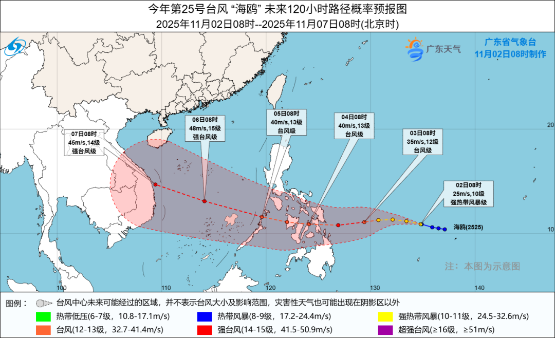 预计“海鸥”将以时速20公里左右向偏西方向移动,4日穿过菲律宾中部,5日移入南海海面,5 - 7日横穿南海南部海面趋向越南中南部沿海,强度逐渐加强,最强可达台风级或强台风级(13 - 15级)。过程中其中心距离我省最近约700公里(距广州约1000公里),对我省陆地和近海无直接影响。