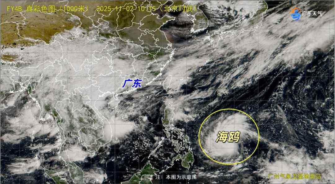 今年第25号台风“海鸥”(热带风暴级)于11月1日晚20时在菲律宾以东的西北太平洋洋面生成。其英文名为“Kalmaegi”,名字源自朝鲜,意为一种海鸟。2日08时,“海鸥”加强为强热带风暴级,中心位于菲律宾马尼拉东偏南方约1550公里的洋面,即北纬10.9度、东经134.8度,中心附近最大风力10级(25米/秒),中心最低气压985百帕,七级风圈半径120 - 180公里。