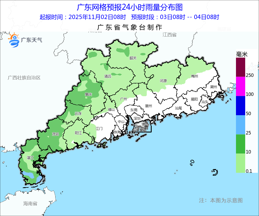 具体而言,11月2日,粤北和珠三角北部多云到阴天,有零星小雨,其余市县多云间阴天。