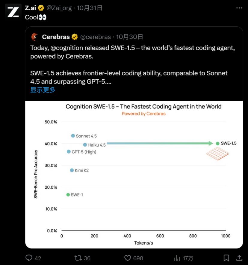 估值93亿美元的美国平台Vercel宣布将智谱GLM - 4.6纳入其官方API服务,全球最大的推理芯片公司Cerebras近期发布官方邮件称从11月5日起将GLM - 4.6作为主推模型。云服务平台Together AI宣布部署阿里巴巴的Qwen - 3 - Coder,AI推理平台Featherless也在Kimi K2发布时即宣布支持其新模型。