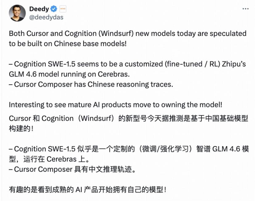 最近,美国最早跑出PMF的编程工具Cursor和Windsurf,都推出了自有模型Composer和SWE - 1.5。之后,两家模型均被证实采用中国大模型。