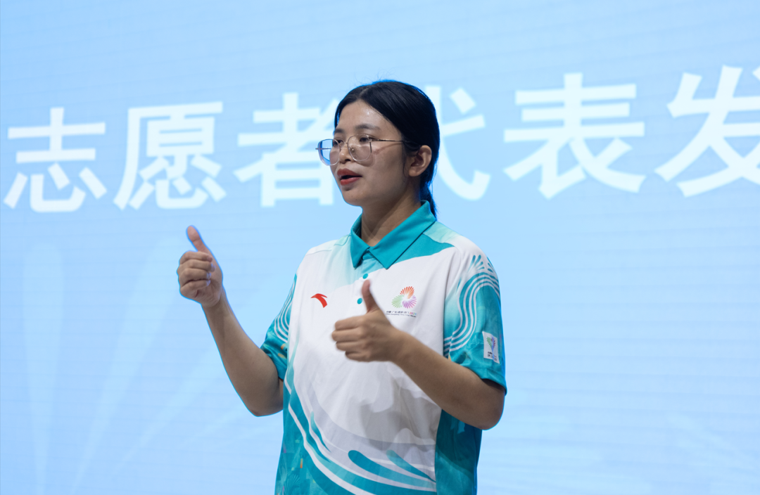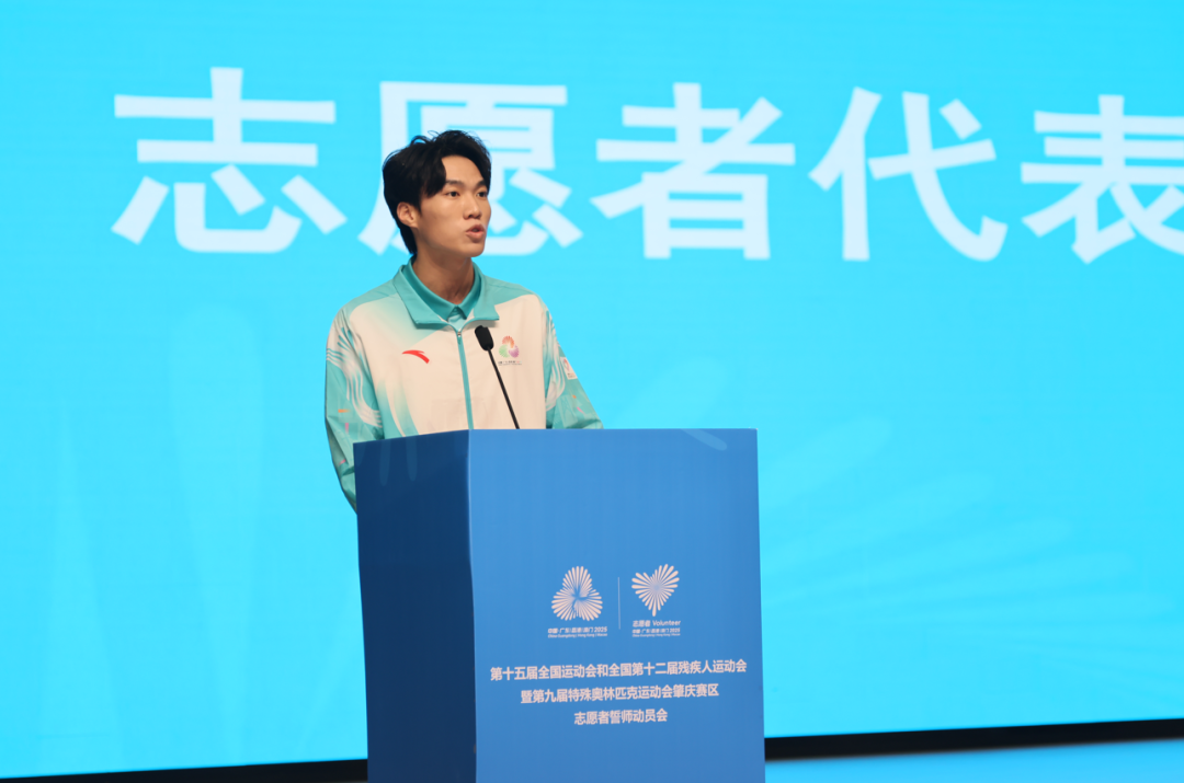 活动中,肇庆学院志愿者领队老师何艺珊和广州应用科技学院志愿者代表陈健作为赛会志愿者代表发言。何艺珊结合自身在粤港澳地区超3500小时的志愿服务经验,鼓励志愿者以专业能力传递湾区融合的包容精神;陈健分享了在体操、马拉松等赛事中为参赛者提供暖心服务的经历,并表示将以1158小时的志愿服务经验,全力以赴投身于十五运会体操赛事服务。