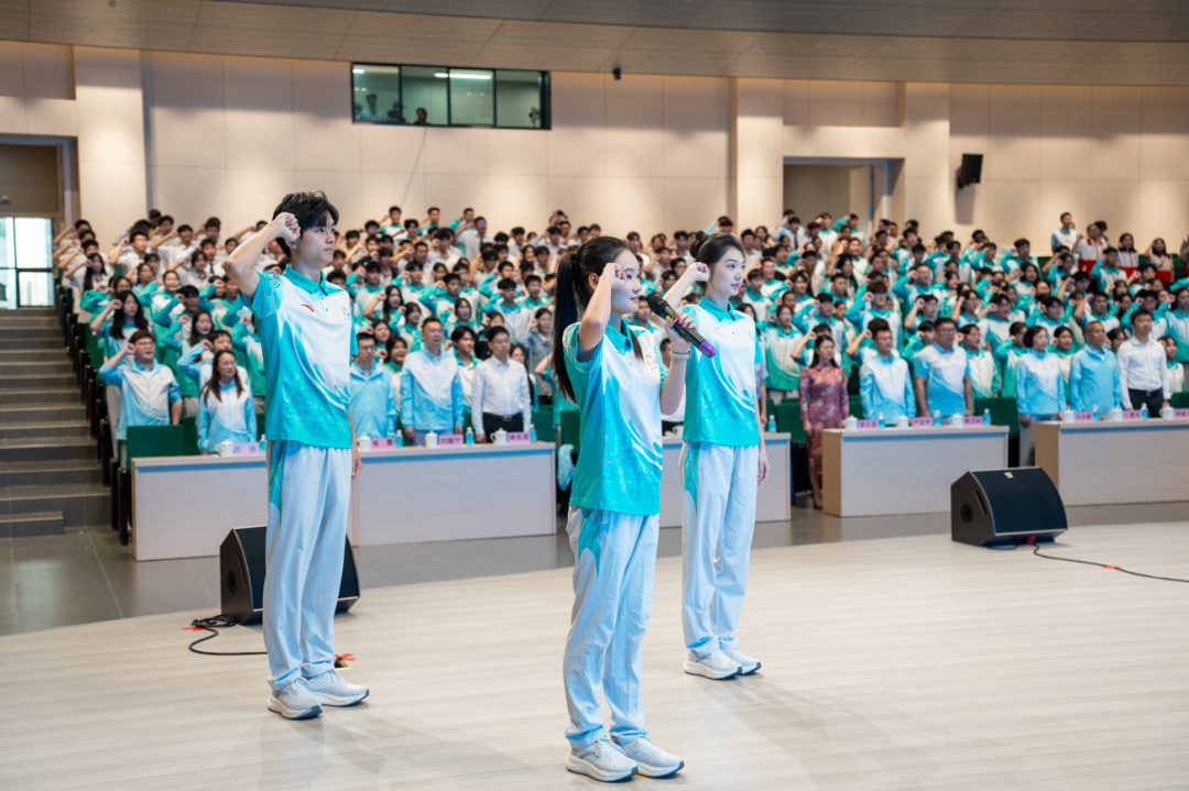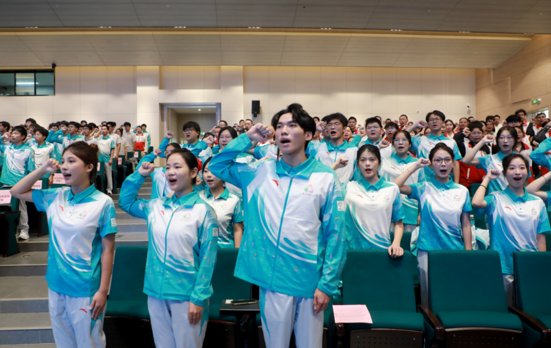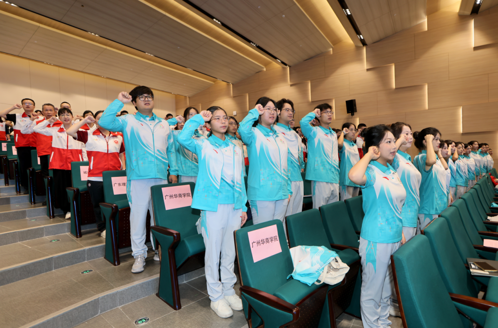 在授旗环节,市执委会志愿者工作部相关成员单位负责人分别为肇庆学院、肇庆医学院、广东理工学院、广州应用科技学院、广州华商学院以及城市志愿服务队授旗。志愿者代表挥舞旗帜,现场掌声雷动。随后,全体志愿者在领誓人带领下庄严宣誓:“为湾区添彩,为祖国争光!为你,更精彩!”誓言铿锵,展现了志愿者们服务赛会的坚定信念与昂扬斗志。