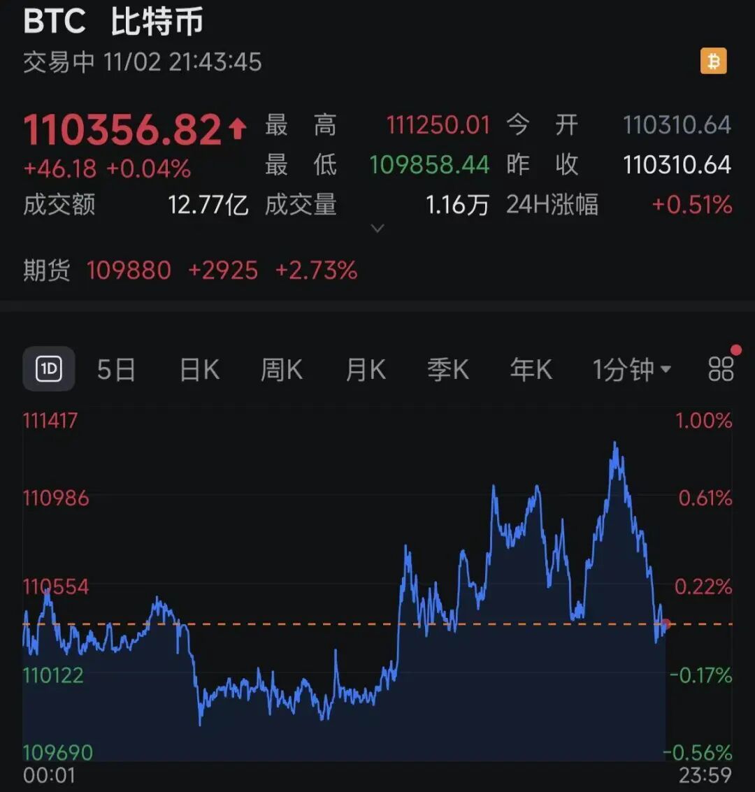 晚间时分,比特币突然出现剧烈震荡。截至发稿时,比特币呈微涨态势,不过盘中曾一度跌破110000美元。与此同时,以太坊、狗狗币等加密货币却纷纷下跌。