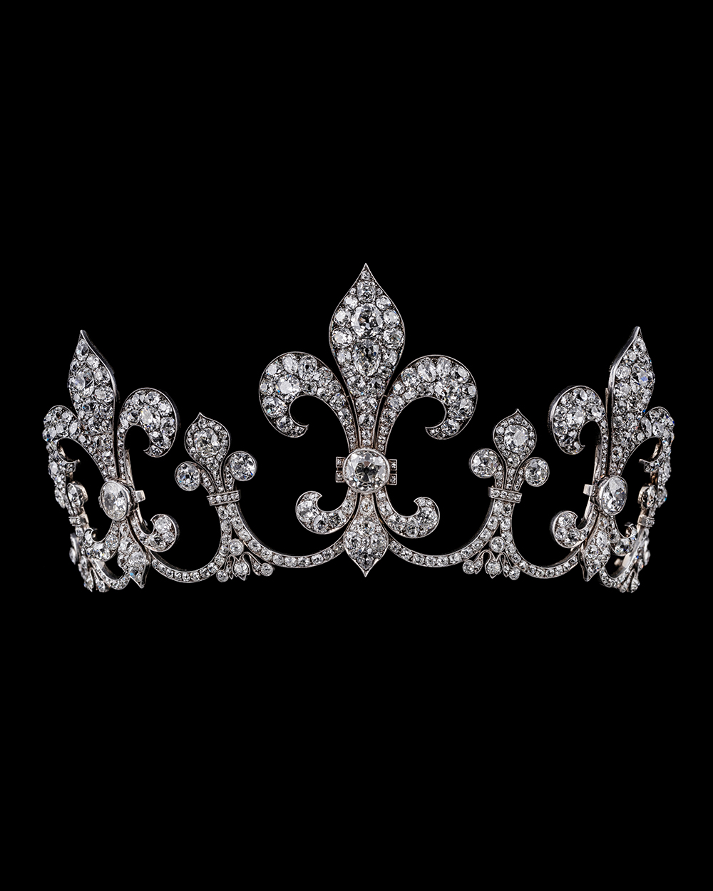 V MUSE联合创始人兼CEO樊晓光向澎湃新闻记者介绍,这顶罕见的重要冠冕诞生于1912年,以“百合”图案(fleur - de - lys)为造型,以铂金为基座,背面是黄金,整体镶嵌着古老钻石,镶嵌工艺精湛,钻石品质优良。特别的是,三只大“百合”可以拆下来作为三枚胸针,适用于不同场合。