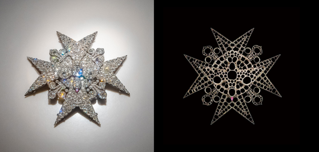 左图为查理十世的圣灵骑士勋章。右图为被取掉钻石的圣灵骑士勋章,只余一个空架子。
