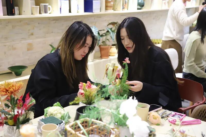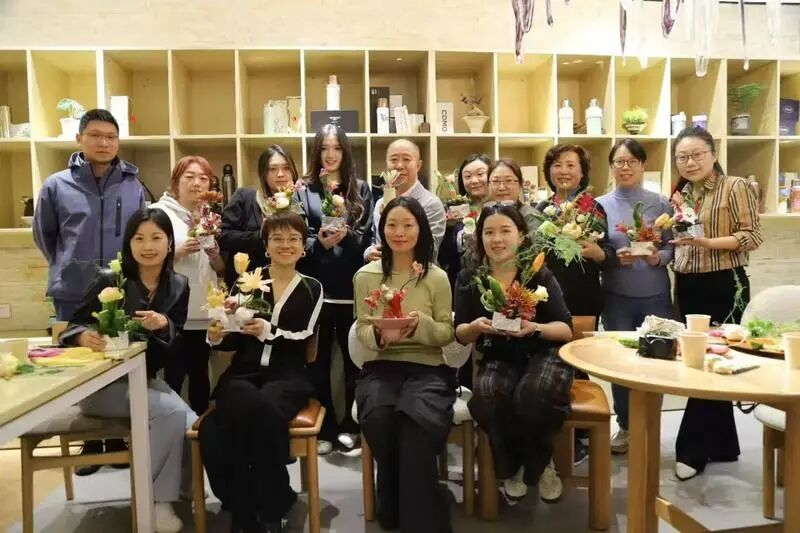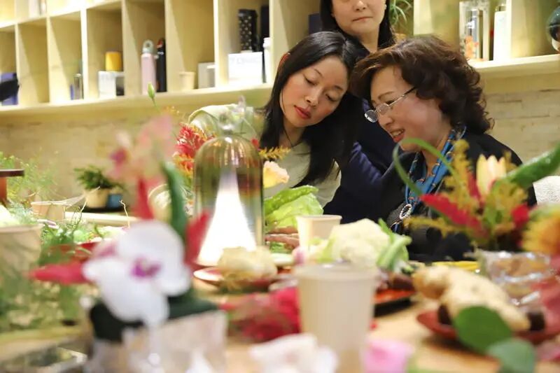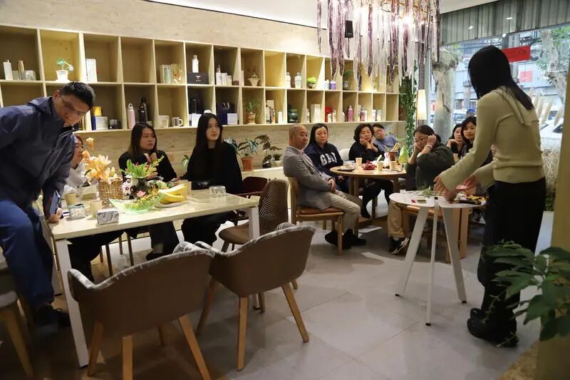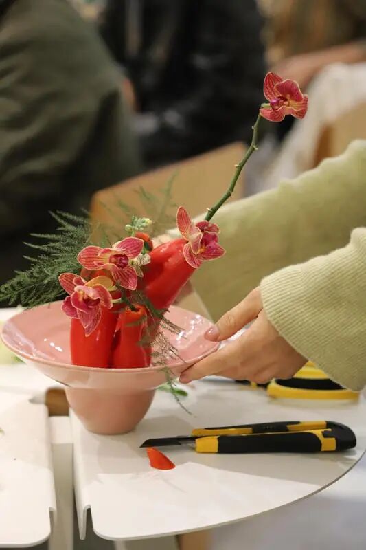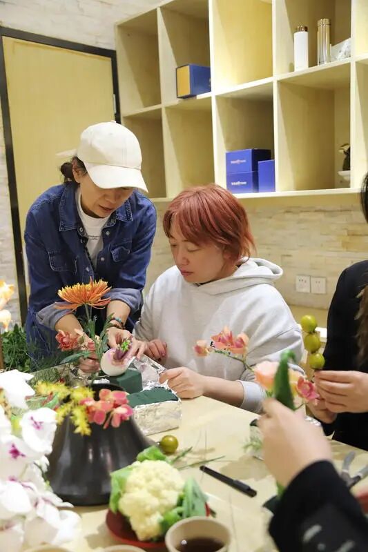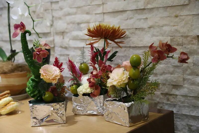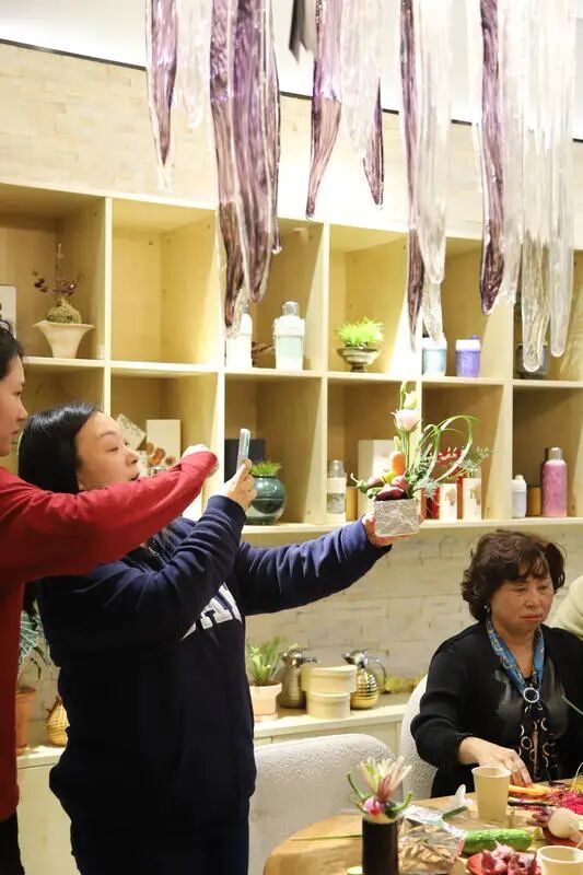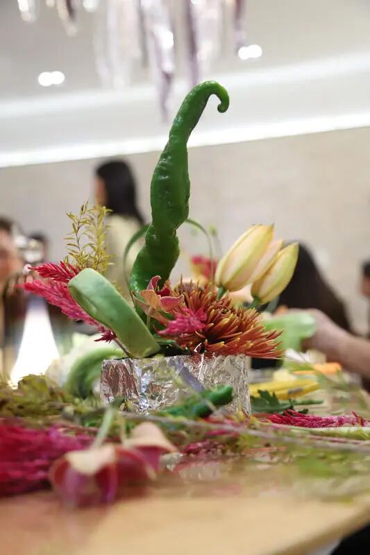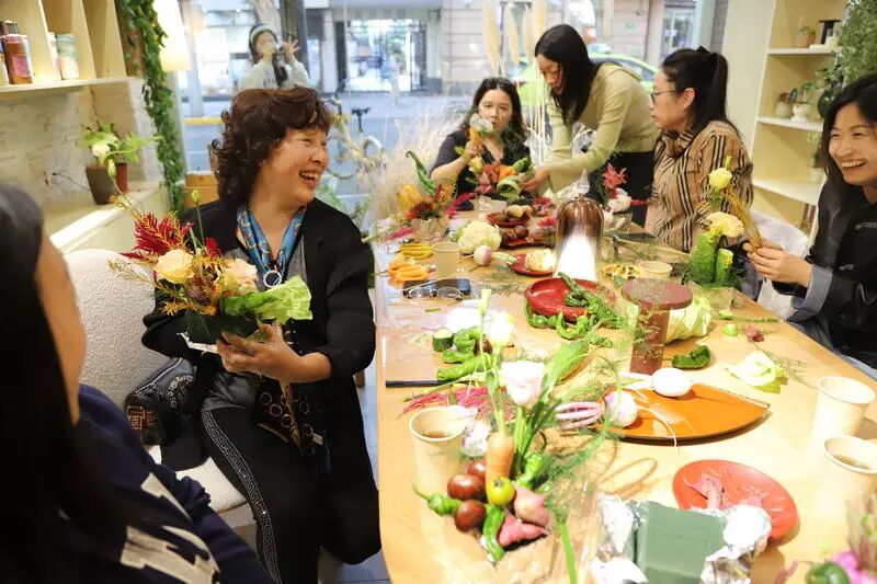 活动现场,彩椒、萝卜等常见食材与鲜花巧妙组合,散发出一种质朴而灵动的艺术气息。企业代表们一踏入店内,就被田园般的布置和眼前的“可食花材”所吸引,纷纷拿起蔬果仔细端详、认真构思,个个跃跃欲试。在花艺老师的悉心指导下,大家从挑选材料到修剪固定,都全身心地投入到创作中,还不时交流灵感,欢声笑语不断。