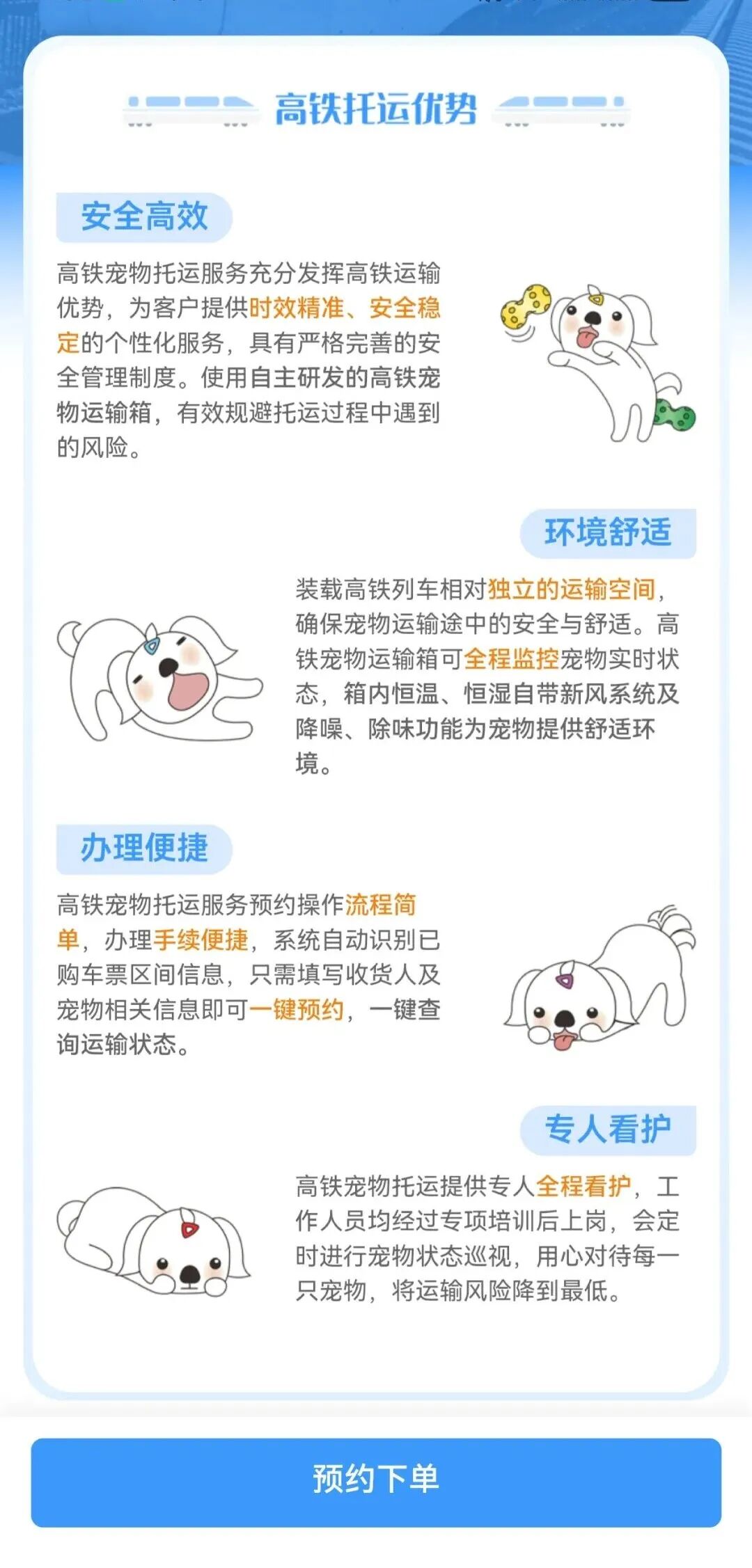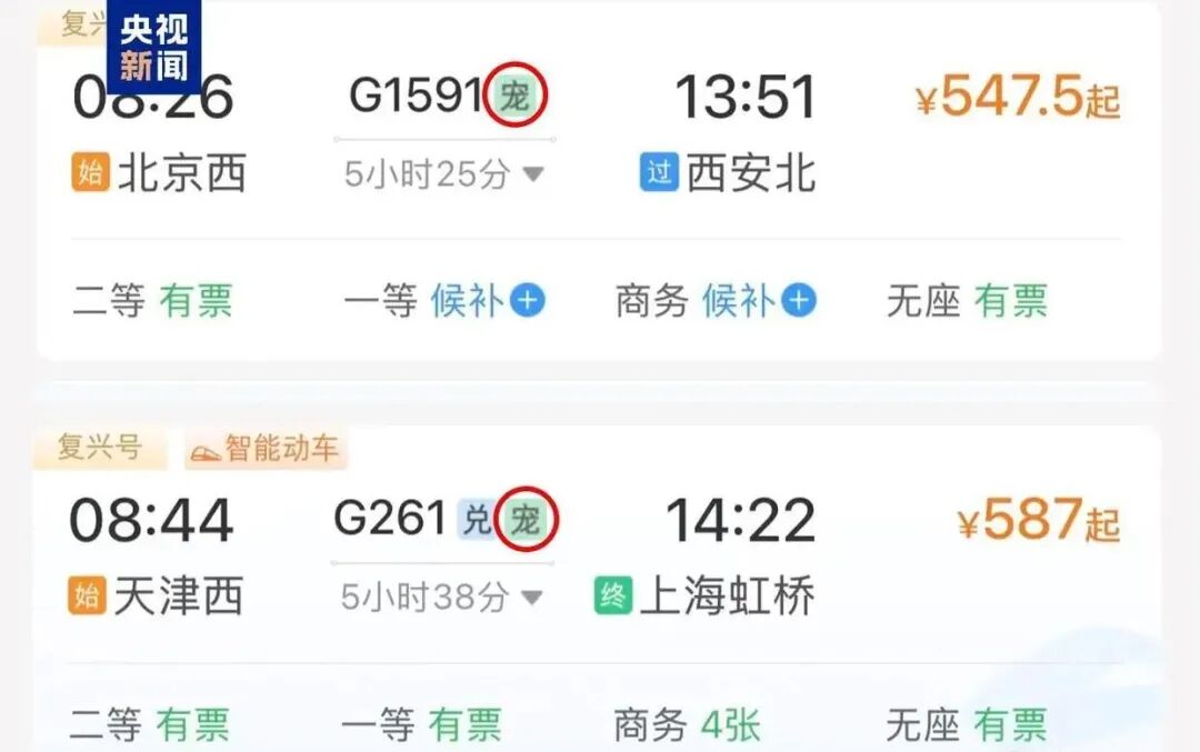 近日,铁路12306官方购票页面,部分列车车次信息旁已有“宠”字标识。这代表,这趟列车可办理宠物托运业务。目前全国有40座高铁站可办理。宠物单独托运服务也已推出。托运人须在计划托运日期的前2 - 5天,通过拨打95572进行预约,可托运1只宠物。