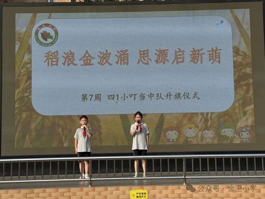 金卫小学四(1)小叮当中队在升旗仪式上宣读节粮倡议书,呼吁全体队员成为“光盘行动”的践行者、粮食知识的传播者和劳动精神的传承者。随后,全体队员齐声唱响《悯农》,在歌声中体会到耕种的不易和“粒粒皆辛苦”的深意。