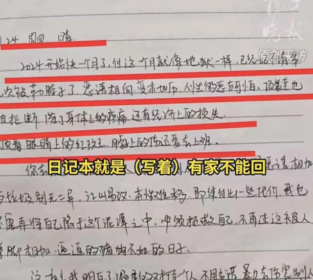 根据董某某姐姐向记者提供的日记照片显示,上面写道“这一个月就像地狱一样,已经记不清第几次被勒脖子了,恶语相向、变本加厉,除了身体上的疼痛,还有经济上的损失;恐惧、害怕、无助、彷徨,被人威胁,被人拿刀架在脖子上,有家不可回。”