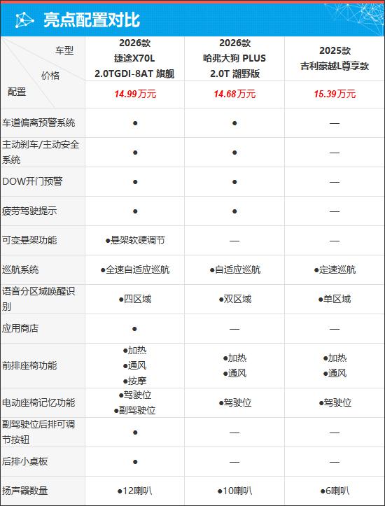 车辆配置上,捷途X70L在便捷舒适配置、智能娱乐配置方面优势明显。它独享前排座椅按摩、副驾驶位电动座椅记忆、副驾驶位后排可调节按钮和后排小桌板,舒适体验佳;还提供四区域语音唤醒识别、应用商店,扬声器多达12个。哈弗大狗PLUS表现均衡,安全配置齐全,有车道偏离预警系统、DOW开门预警、疲劳驾驶提示等,且提供双区域语音唤醒识别。吉利豪越L尊享款在安全配置和辅助驾驶能力上有待提升,仅提供定速巡航。