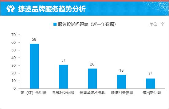 从服务投诉来看,“定(订)金纠纷”是车主对捷途品牌抱怨较多的问题,主要集中在捷途旅行者和捷途自由者车型。