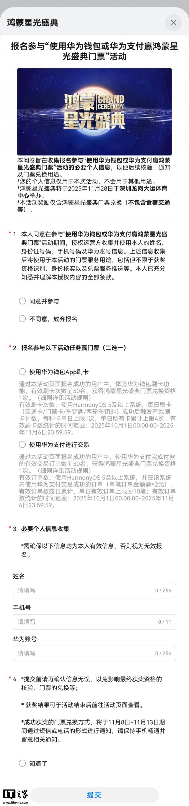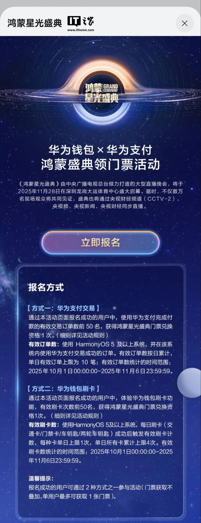 IT之家发现,华为钱包App已开启央视《鸿蒙星光盛典》门票兑换活动,关键细则如下: