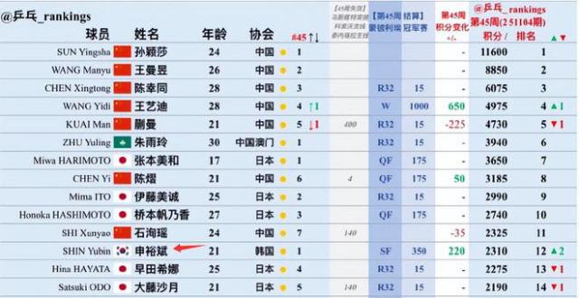 此外,她在法国站进入四强拿到了350积分,算上失效的三站积分,净增220分,总积分达到2310分,超过了大藤沙月、早田希娜,升至世界排名第12。