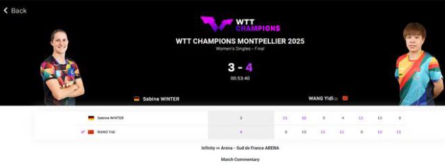 这场比赛,王艺迪赢得异常艰难。不知是否蒙彼利埃对欧洲选手有加成,决赛中温特状态神勇,开场就以2-0大比分领先王艺迪。随后王艺迪扳平至2-2,但在关键的天王山之战中,温特又拿下,以3-2大比分领先。不过,王艺迪抗压能力超强,最终完成4-3的大逆转。