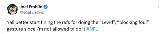 恩比德不认可这笔罚款,他在社媒上回应说:“既然我这么做不行,那你们最好也开始罚裁判——他们比手势判‘阻挡犯规’,这也够‘不雅’的。”
