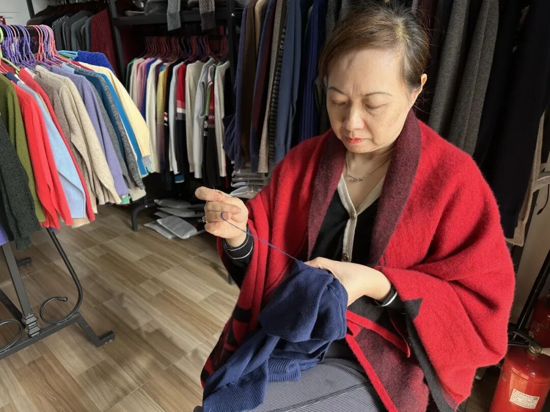 福中路上的“郁金香羊绒批发”店,店主陶女士出身纺纱厂,后自办工厂,始终扎根生产一线。创业初期客源不稳定、工人难留,她咬牙熬过了最难的时光,如今依旧早出晚归,用心打磨每一件羊绒衫。她选料只挑细腻优质的羊绒,纺线、编织工艺严格,成品糯滑亲肤,贴身穿毫无不适感。不少老顾客说:“孩子从幼儿园穿到高中,每年冬天必来订,软乎乎从没过痒,跟着孩子长大的衣服,放心!”遇到顾客的绒衫有小破损,她还会主动帮忙免费缝补,针脚细密得几乎看不出痕迹。