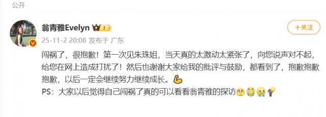 11月2日晚,翁青雅发文道歉: