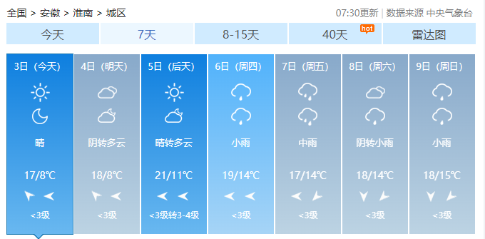 具体到淮南,预计6日前,淮南以晴到多云的天气为主,6日起将有一次降雨过程,气温也会略有起伏。