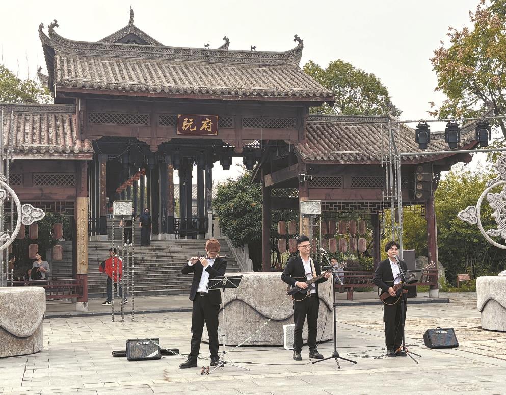 演艺新空间不断拓展,在芜湖鸠兹小镇内,上海街艺音乐组合正在精彩演出。文汇报记者 孙彦扬摄