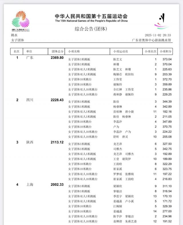 在女子团体双人3米跳板比赛里,广东队组合陈艺文 / 林珊同样表现卓越,夺得第一名。女子团体10米跳台比赛中,广东队选手王伟莹发挥稳定,斩获第一名。女子团体3米跳板比赛,陈艺文再度展现强大实力,摘得第一名。
