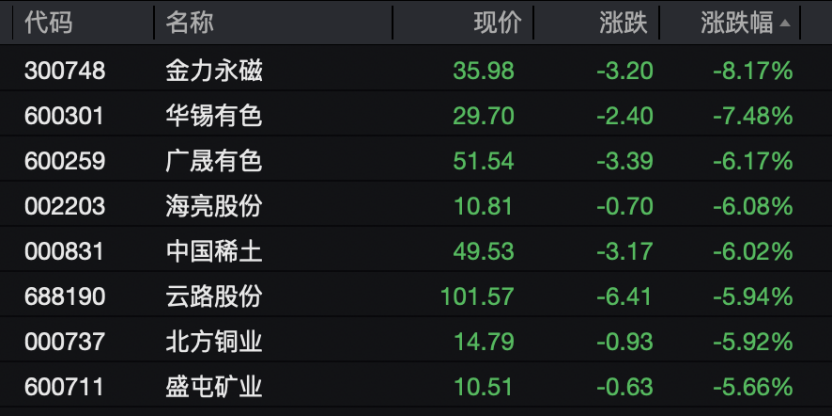 有色金属板块则遭遇重挫,盘中跌幅一度接近4%,后有所收窄。金力永磁、华锡有色、广晟有色、海亮股份、中国稀土等多只股票跌幅超过6%,北方铜业、腾远钴业、大地熊、永兴材料、云南铜业等跌幅超过5%。
