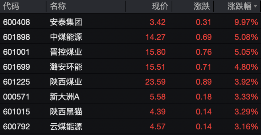 从主要行业板块和赛道来看,若按照申万一级行业划分,煤炭板块领涨,盘中涨幅一度超过3%。安泰集团涨停,晋控煤业、中煤能源、潞安环能、陕西煤业、陕西黑猫、云煤能源等纷纷跟涨。